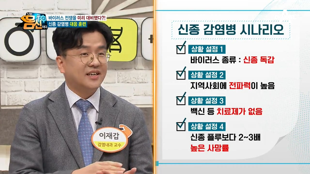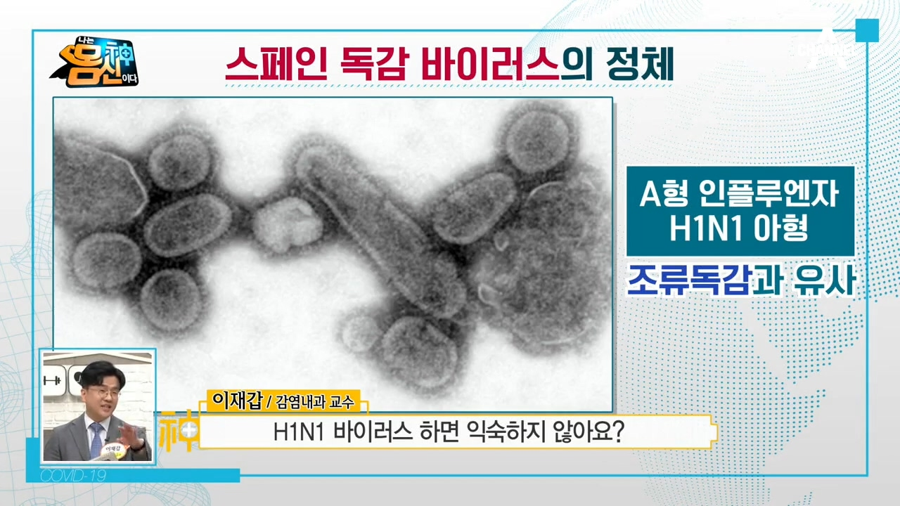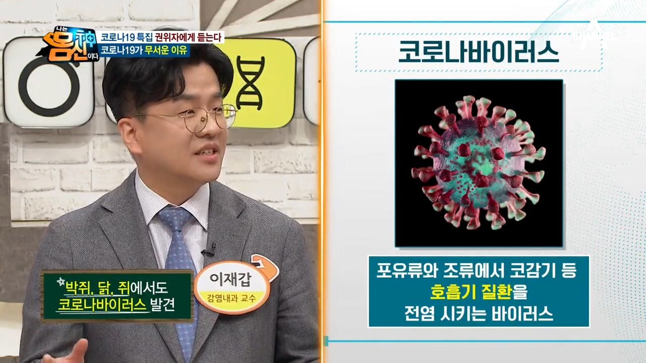‘나는 몸신이다’ 코로나19 감염증 특집 방송 신종플루 / 코로나19 / 백신개발 이재갑 강남성심병원 감염내과 교수가 28일 밤 9시 50분에 방송되는 ‘나는 몸신이다’ 277회에 출연해 인류 생존을 위협할 신종 감염병을 설명한다. 이 교수는 이날 방송에서 “지금껏 경험한 바이러스 중 코로나19가 가장위험하다.”